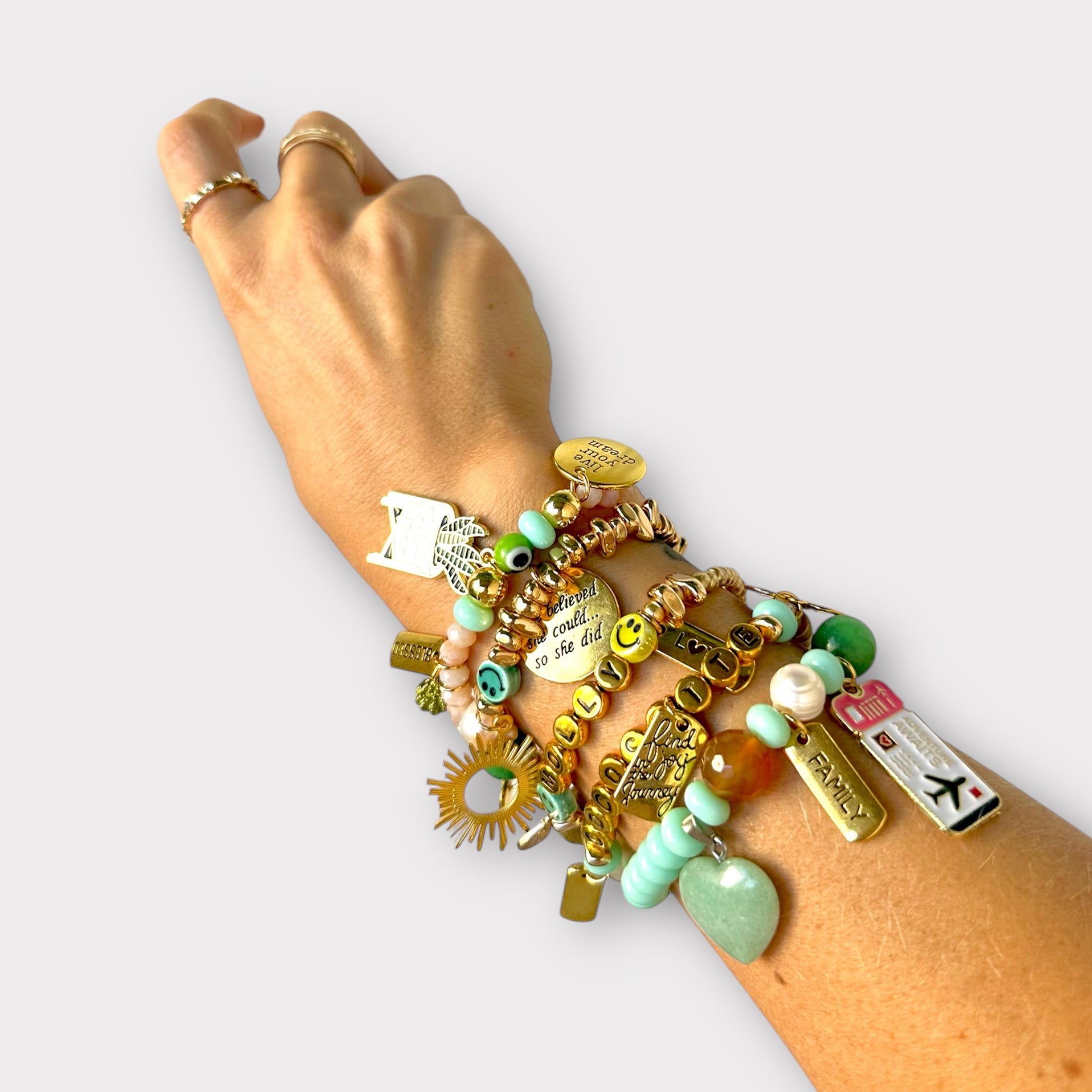 Materials: Crystals, Different tones of green crystal beads, Traveler, Plant Lover, Sun Charms.