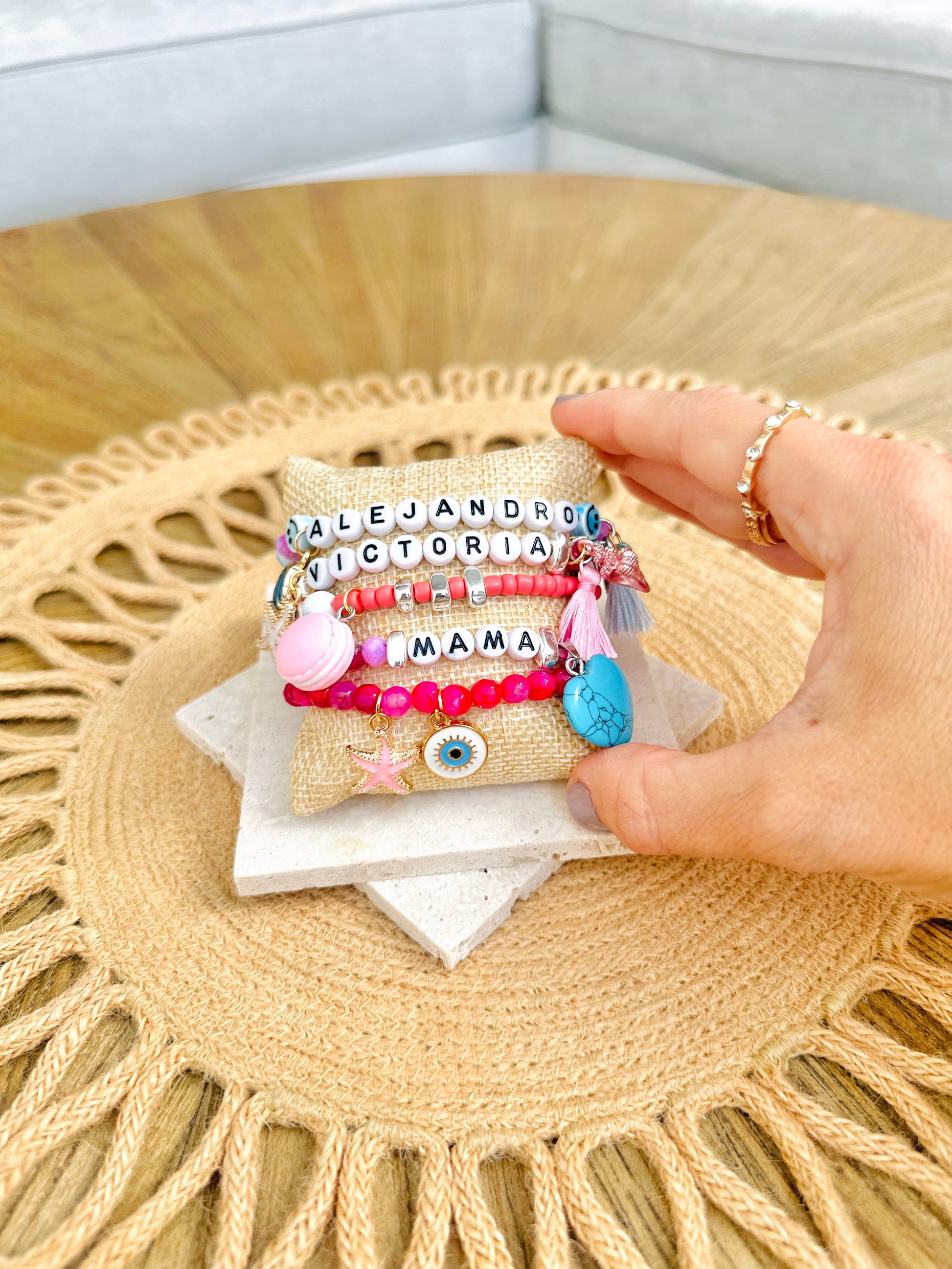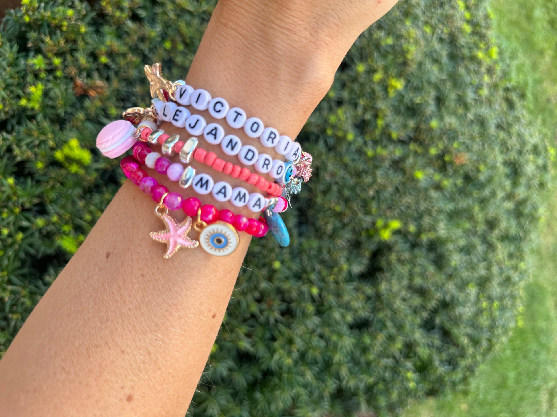 Materials: Crystals, Pink and Blue Beads, Cookie Charm, Turquoise Heart, Light Blue Eye Evil.