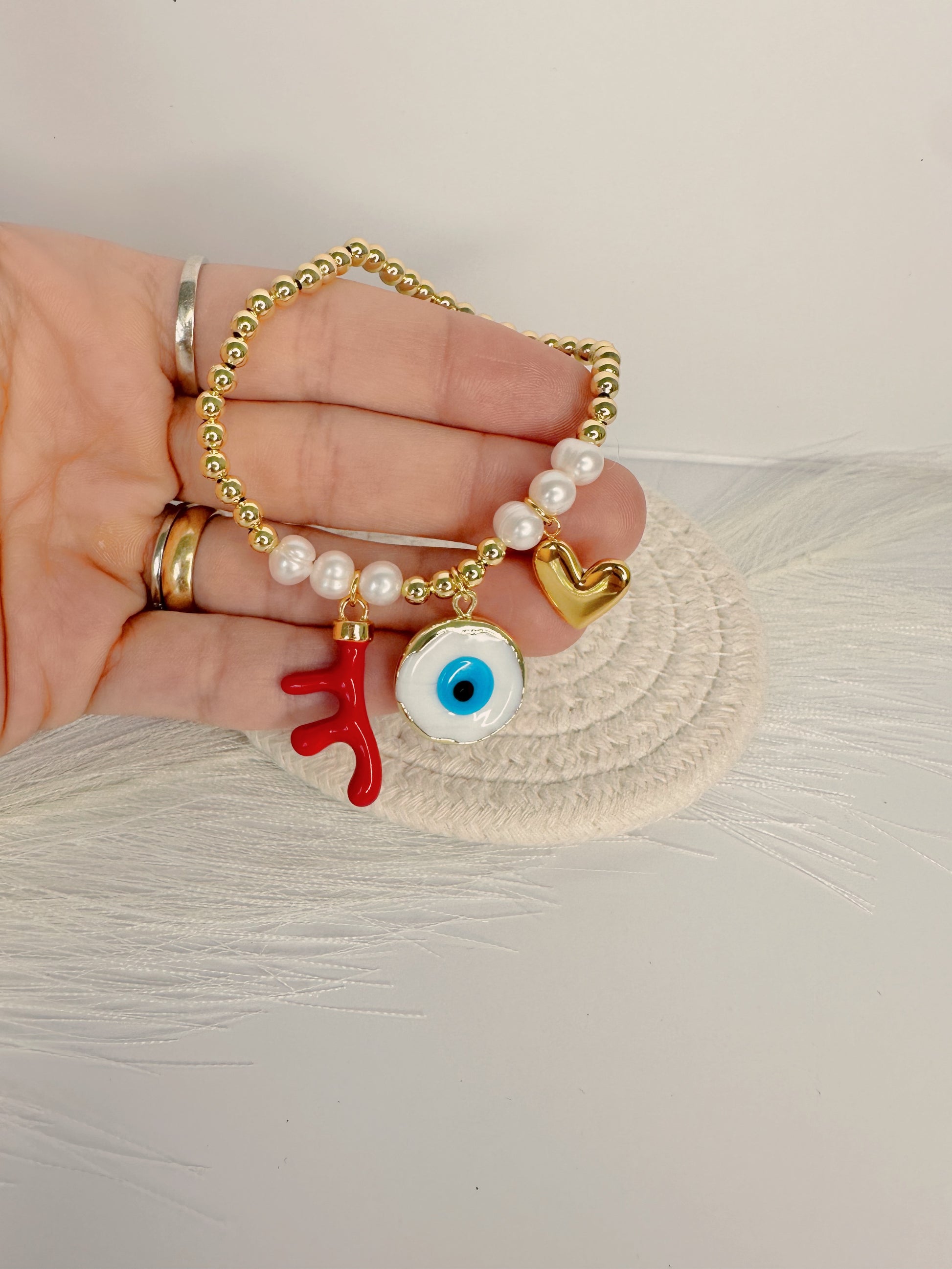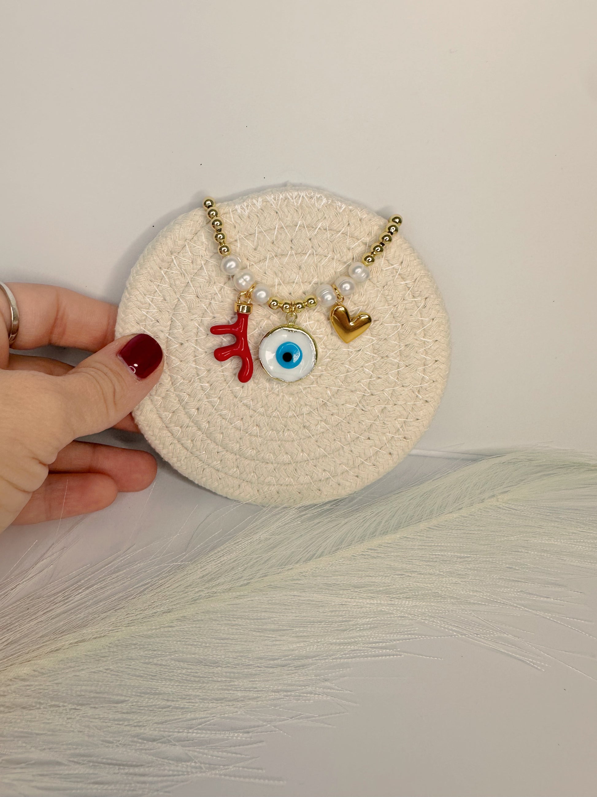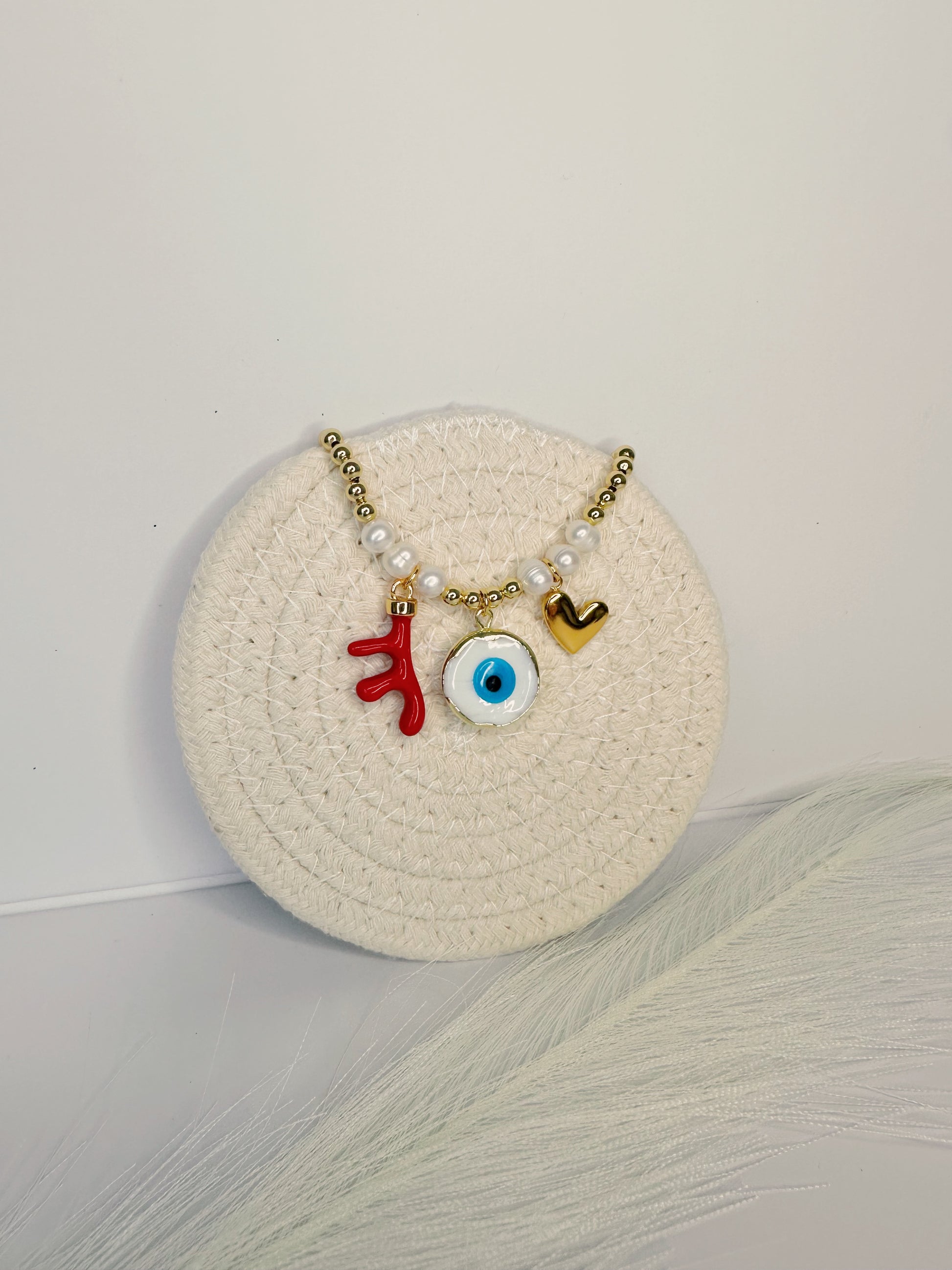 Materials: Murano Art White Evil Eye, Natural Red Coral Branch Bead Pendant, Plated Gold Heart Charm, Real Pearls, beads gold plated 18K.